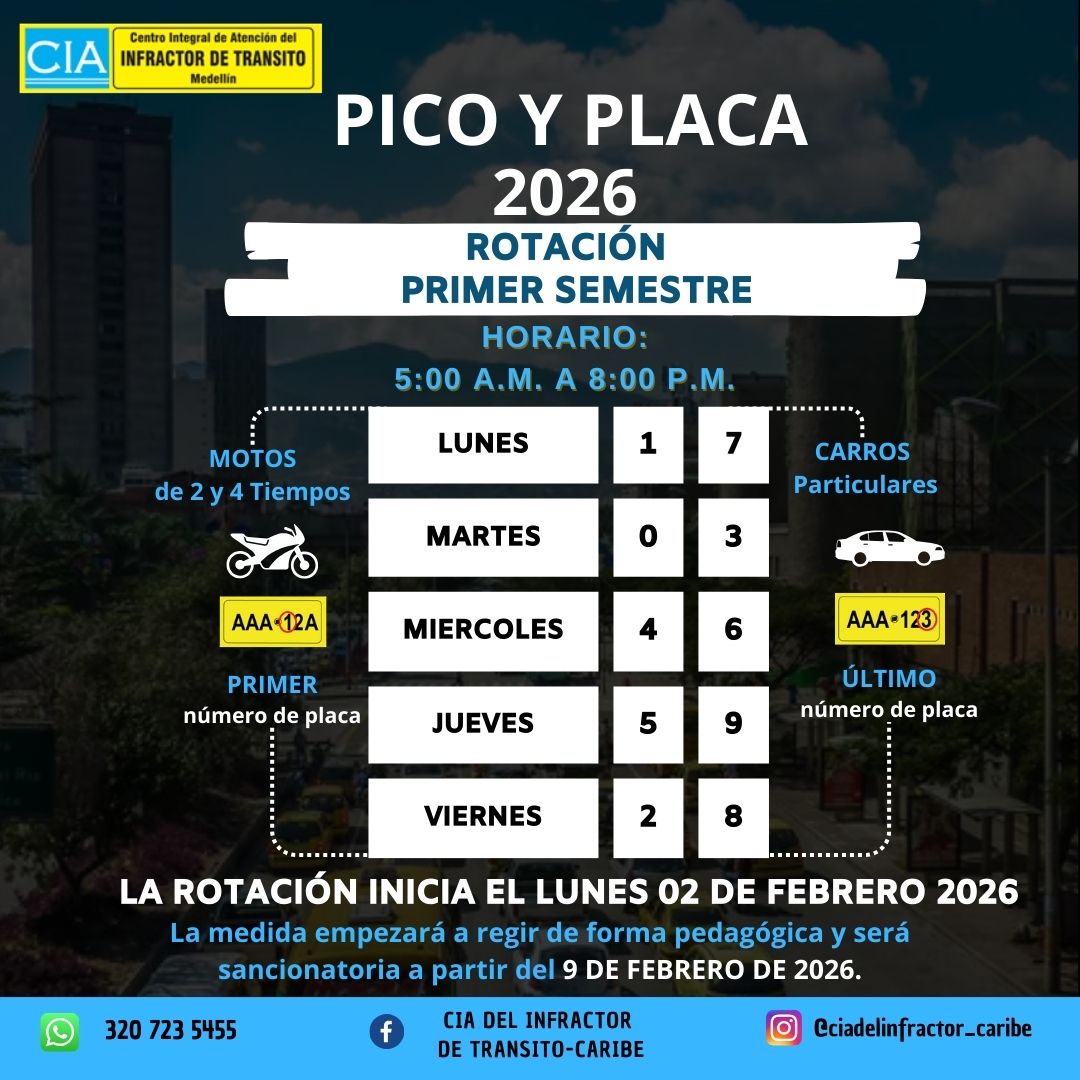 PICO Y PLACA PRIMER SEMESTRE 2026 MEDELLIN Y ÁREA METROPOLITANA